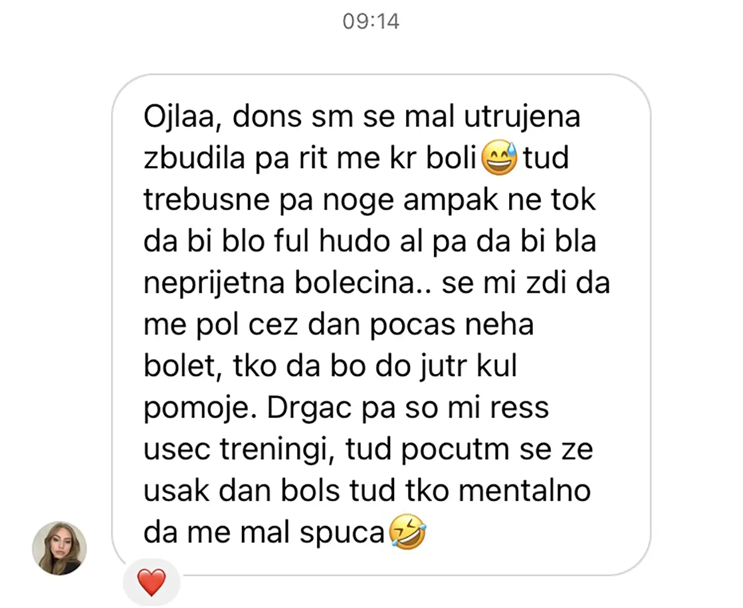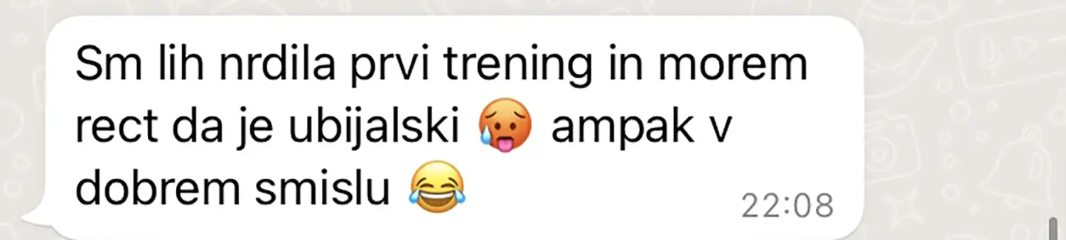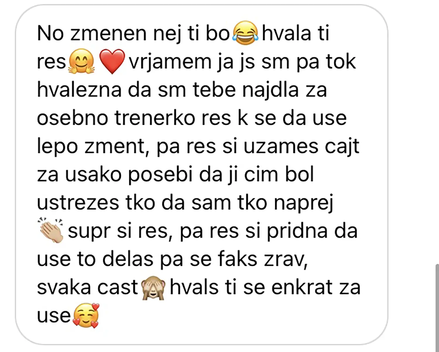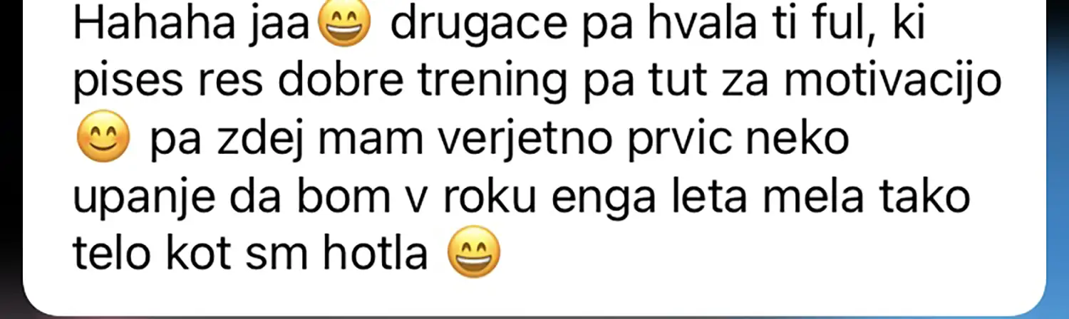 ““Hvala ti za vse napisane treninge in motivacijo. Prvič v življenju imam neko upanje, da bom v roku enega leta imela tako telo, kot sem si ga želela. Počasi že vidim napredek in se iz fitnesa vedno vrnem nasmejana, tudi če je bil trening težek.””